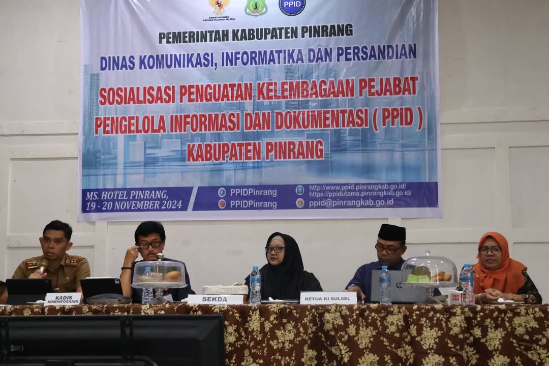 PinrangObedaynewss– Sekretaris Daerah Kabupaten Pinrang, A. Calo Kerrang, mewakili Pj. Bupati Pinrang, membuka kegiatan Sosialisasi Penguatan Kelembagaan Pejabat Pengelola Informasi dan Dokumentasi (PPID) Kabupaten Pinrang di Aula MS Hotel, Selasa (19/11).