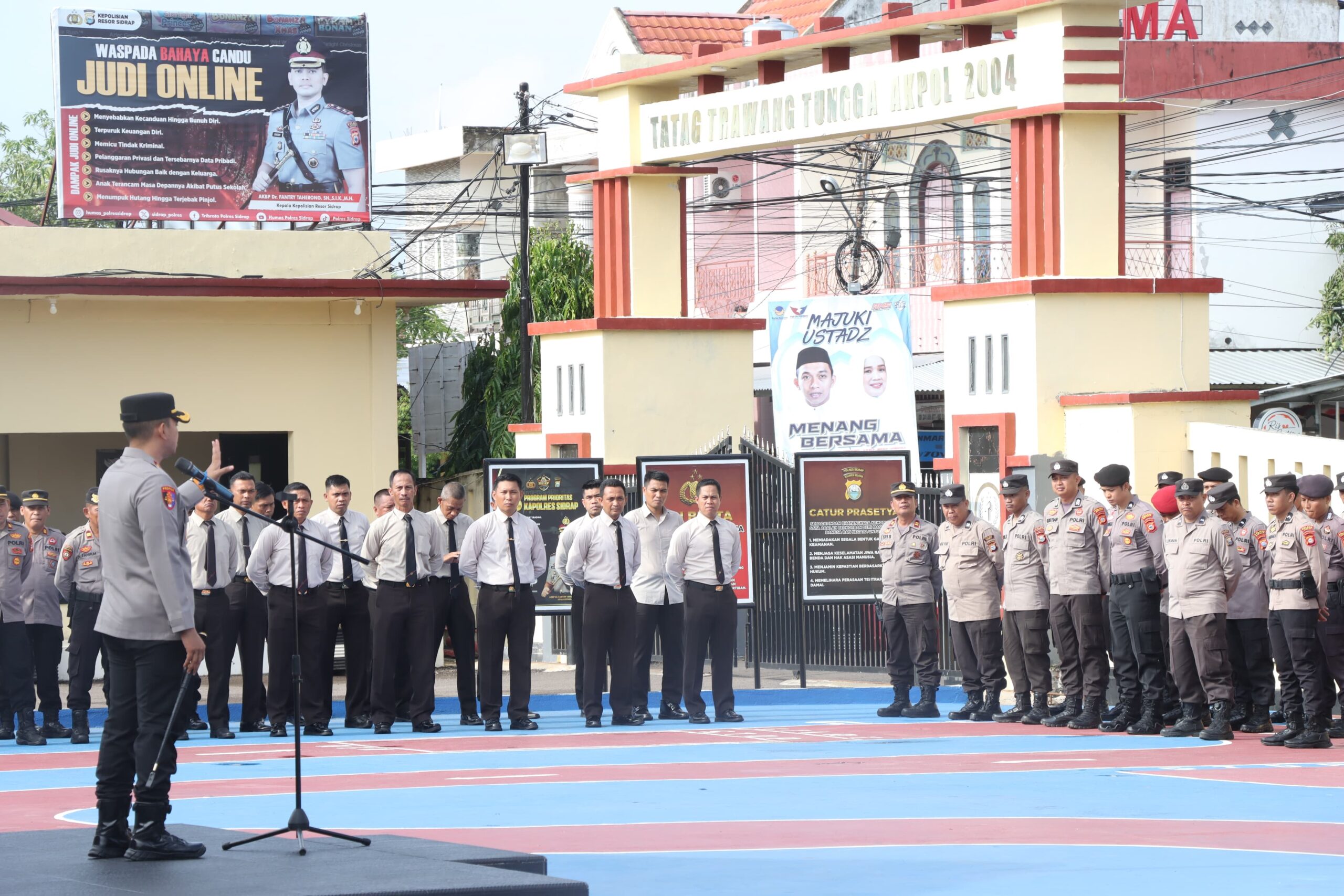 SIDRAP, – Menghadapi pelaksanaan kampanye terbuka di Kabupaten Sidrap, Kapolres Sidrap AKBP Fantry Taherong memimpin apel pagi yang dihadiri oleh PJU, para Kapolsek, Kapolsubsektor, Perwira Staf dan seluruh personel Polres Sidrap.